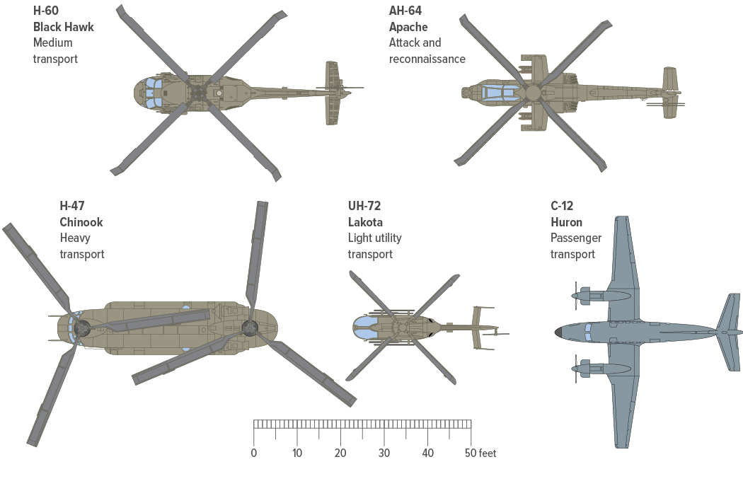Diagramy typů vrtulníků, (UH-60, UH-72, H-47), které může US Army nasadit pro zásobování svých vojsk v případě invaze na iránský ostrov Charg v severní části Perského zálivu, nebo v případě invaze proti iránskému pobřeží a ostrovům v Hormuzském průlivu, (měřítko 10 stop/feet = 3.28 metru). Zdroj: Congressional Budget Office, publikace 60683.