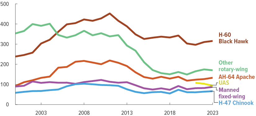 Letové hodiny vrtulníků a dronů amerického letectva, (v tisících ročně). Zdroj: Congressional Budget Office, publikace 60683.