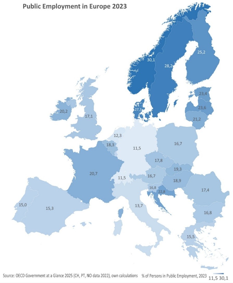 V této souvislosti je pro Babiše určitě pikantní, že v celém Německu činí podíl státních a veřejných zaměstnanců pouze 11.5% ze všech pracujících, kdežto v ČR to Fiala dotáhnul na pěkných 17.8%. Pokud Němci nyní srazí počet svých veřejných zaměstnanců o 8% na 10.58%, měl by Babiš srážet české počty úřednictva aspoň na 16.37%. A to představuje propustit nejméně 80 000 veřejných a státních zaměstnanců, a jen na mzdách by to přineslo úsporu cca 50 miliard CZK. Vzhledem ke stavu českého státního rozpočtu a drastickému růstu zadlužování ČR, by se Babiš měl inspirovat počty veřejných zaměstnanců v Portugalsku 15.0%, ve Španělsku 15.3%, v Itálii 13.7%, ve Švýcarsku 11.5%, v Holandsku 12.3%, nebo aspoň v Rumunsku 17.4%, či v Bulharsku 16.8%, nebo v Rakousku 16.7%. Zda by snižování počtů veřejných zaměstnanců v ČR využil Milion chvilek, a jal se ryčet na Babiše ještě mohutněji, je bohužel představitelné. Stejně jako známá skutečnost, že současná parlamentní opozice se bála počty veřejných zaměstnanců za své fialové vlády snižovat, aby nedopadla ve volbách ještě hůře, než nakonec skončila. Jak skončí v příštích volbách Babišova současná politická koaliční kohorta, je tak nasnadě, pokud se budou reforem bát stejně jako předchozí vyhlášený deformátor profesor Petr Fiala. (Viz grafika OECD nahoře, podrobně s více údaji zde.)