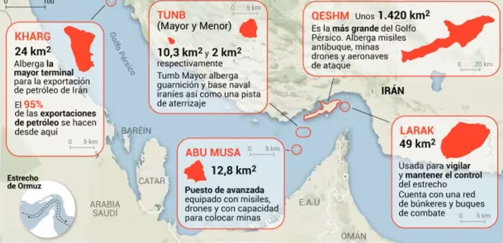 Mapa iránských ostrovů, na které se mohou nyní USA pokusit provést pozemní invazi. Pouze jediný z těchto ostrovů Abu Musa odpovídá svou geografickou polohou i charakteristikou aspoň částečně americkým štábním poučkám, které definují pravděpodobnost úspěchu každé válečné operace skutečností, zda se nachází v rozumném rozmezí reálných schopností americké armády trvale zabezpečit všechny její nezbytné logistické potřeby.