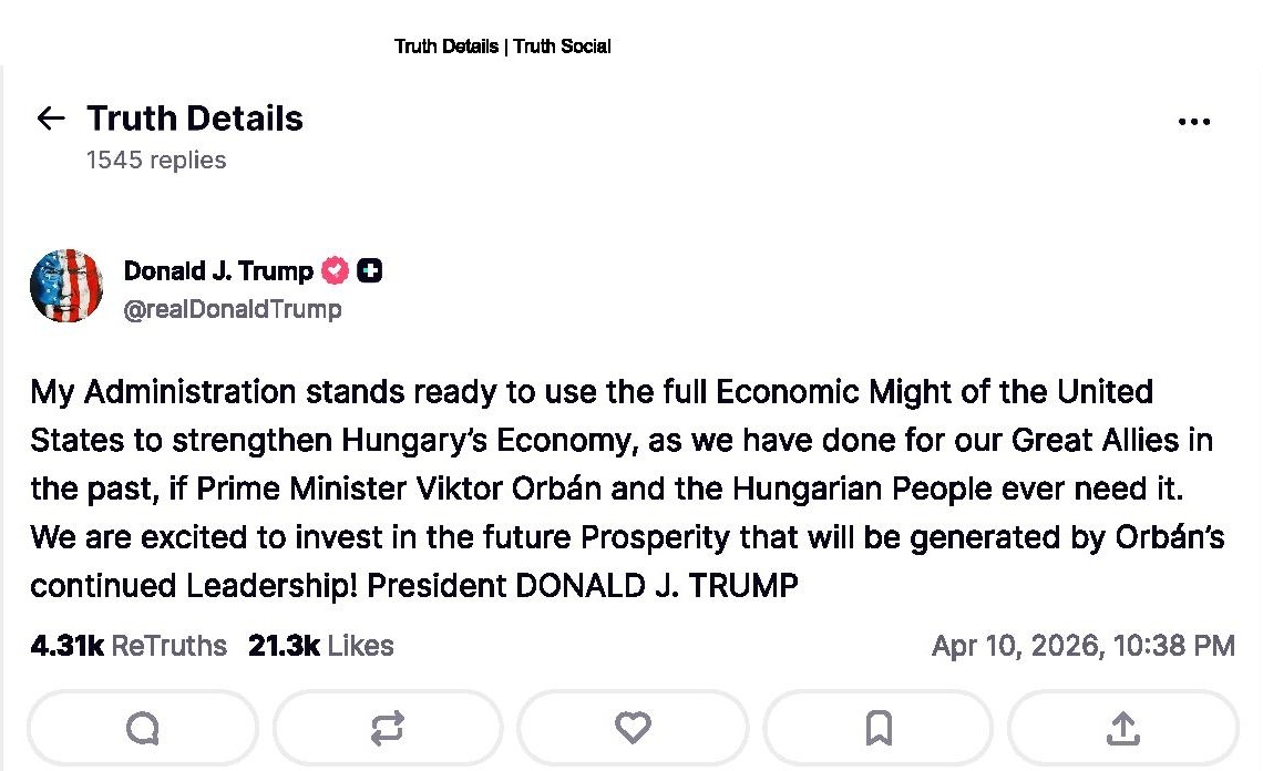 Včera prezident USA Donald Trump podpořil tím nejvyšším myslitelným způsobem Viktora Orbána před klíčovými parlamentními volbami, které se v zemi konají v neděli 12. dubna. I nejzavilejším nepřátelům Viktora Orbána – Ukrajincům – nezbylo včera,než k tomu napsat:
